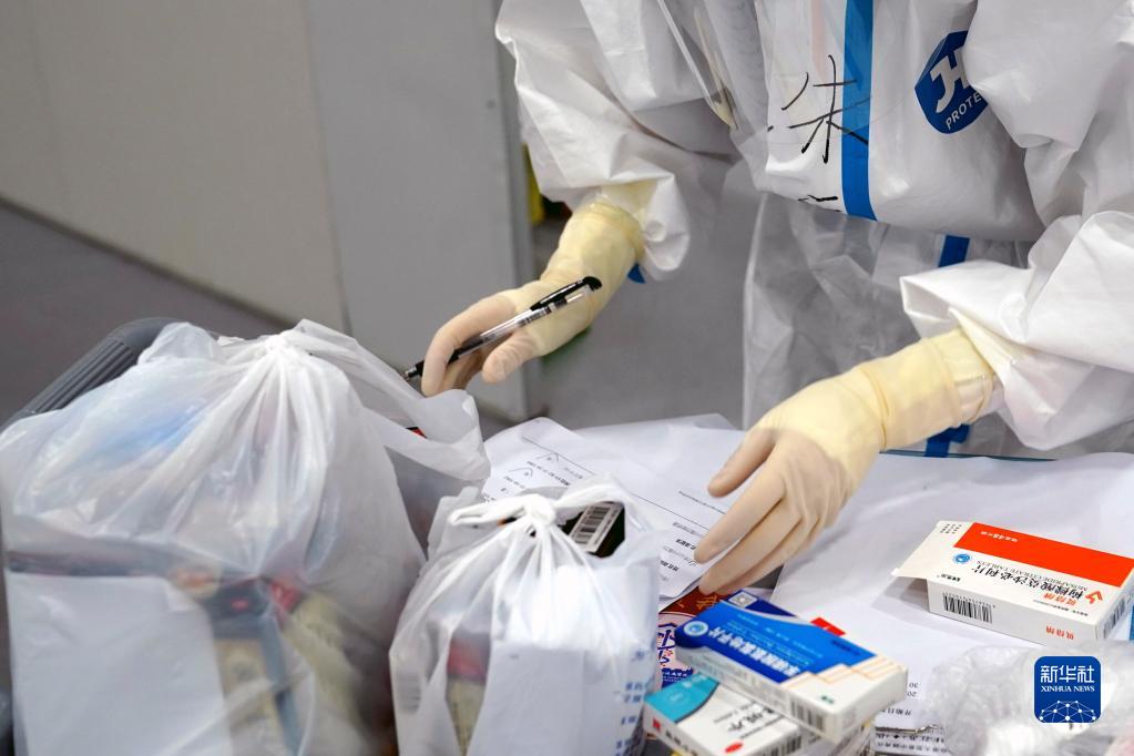 4月30日,上海临港方舱医院的医护人员在整理感染者所用药品。