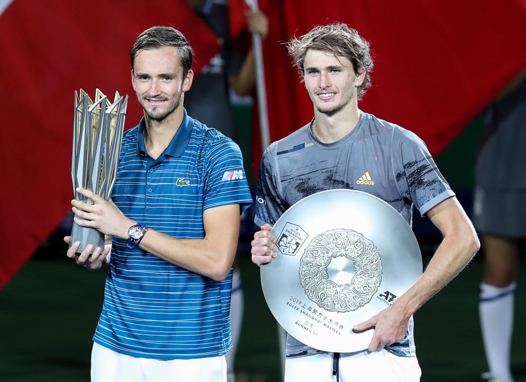 2019年10月13日,在2019年上海大师赛男子单打决赛中,俄罗斯选手梅德韦杰夫以2:0战胜德国选手亚历山大·兹维列夫,获得冠军。新华社记者吴刚摄