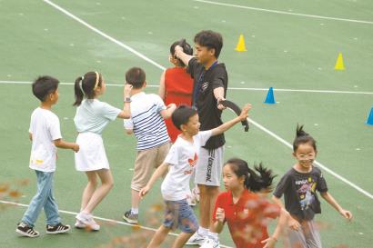 孩子们在徐汇区虹梅街道爱心暑托班办班点上体育课。 记者 赖鑫琳 摄