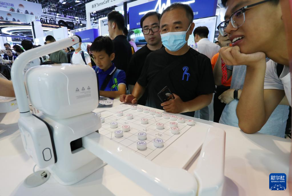 7月6日,参观者在2023世界人工智能大会展会现场与商汤元萝卜AI下棋机器人对弈。