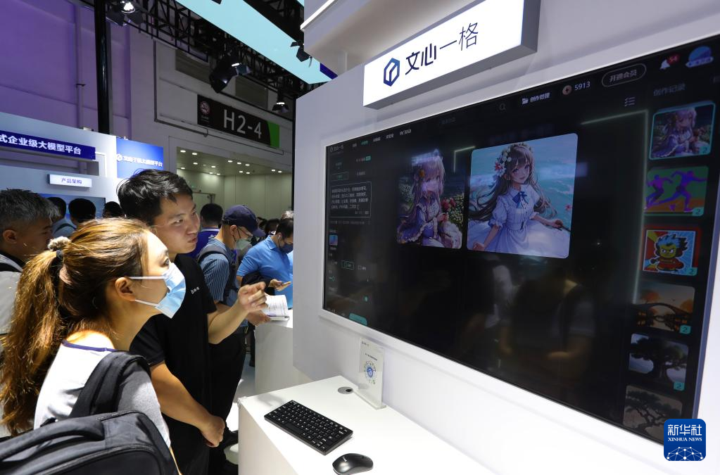7月6日,工作人员在2023世界人工智能大会展会现场向参观者介绍百度“文心一格”。