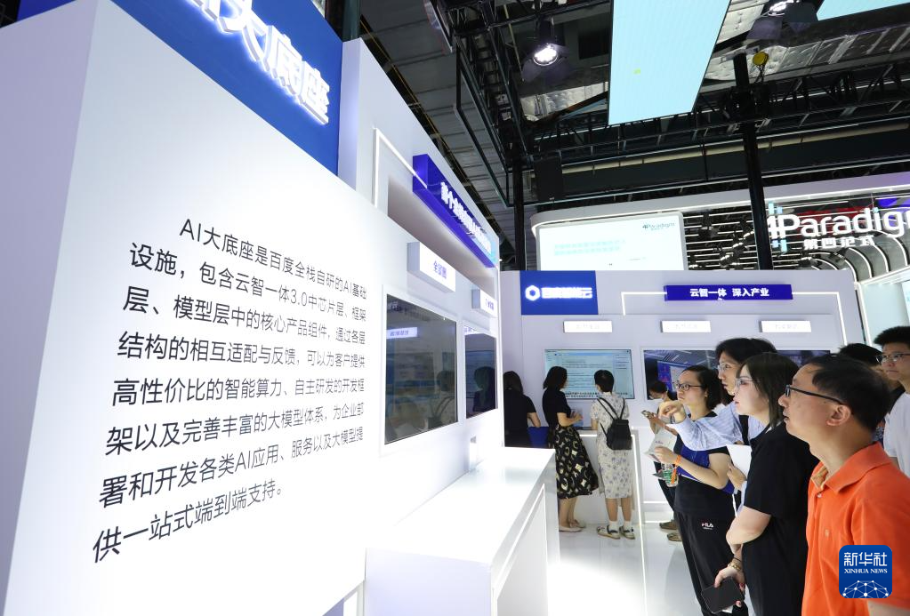 7月6日,参观者在2023世界人工智能大会展会现场的百度“AI大底座”内容介绍展台前驻足观看。
