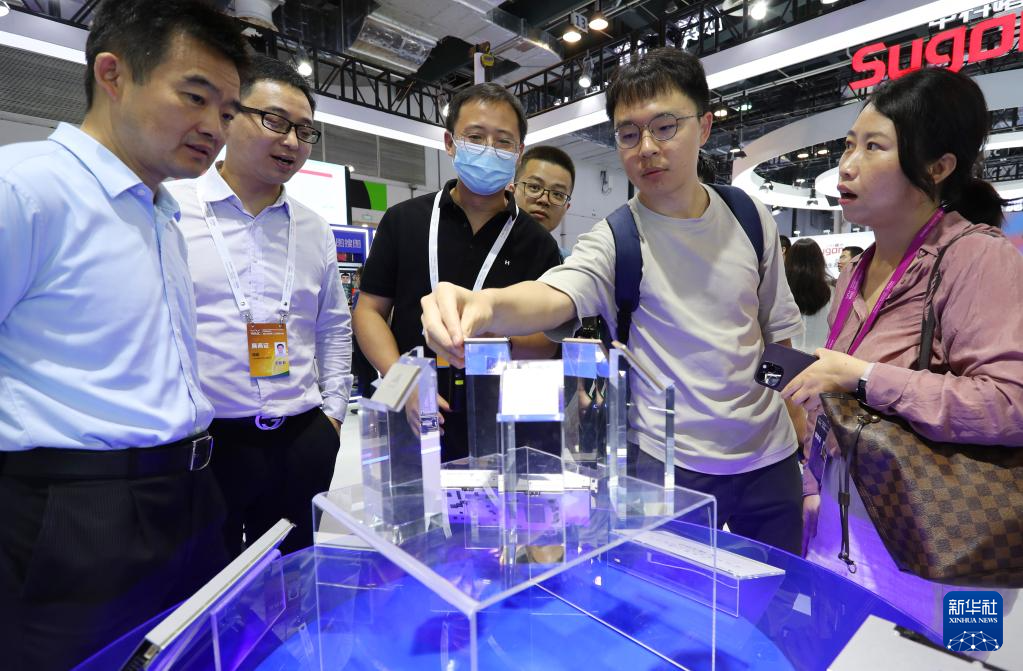 7月6日,参观者在2023世界人工智能大会展会现场的通用GPU芯片展品前交流。