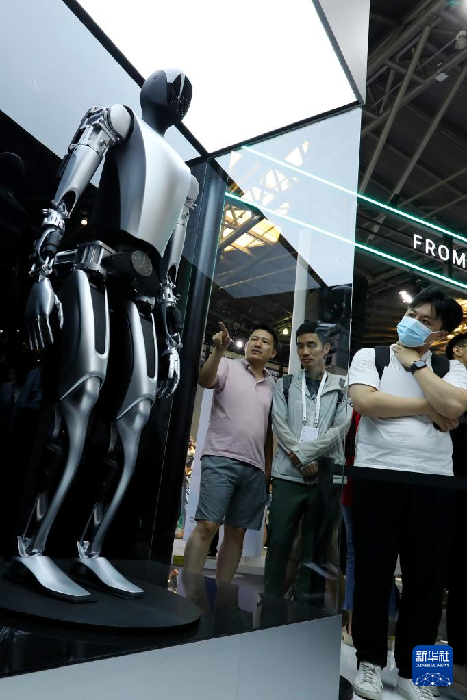 这是7月6日在2023世界人工智能大会展会现场拍摄的特斯拉机器人。