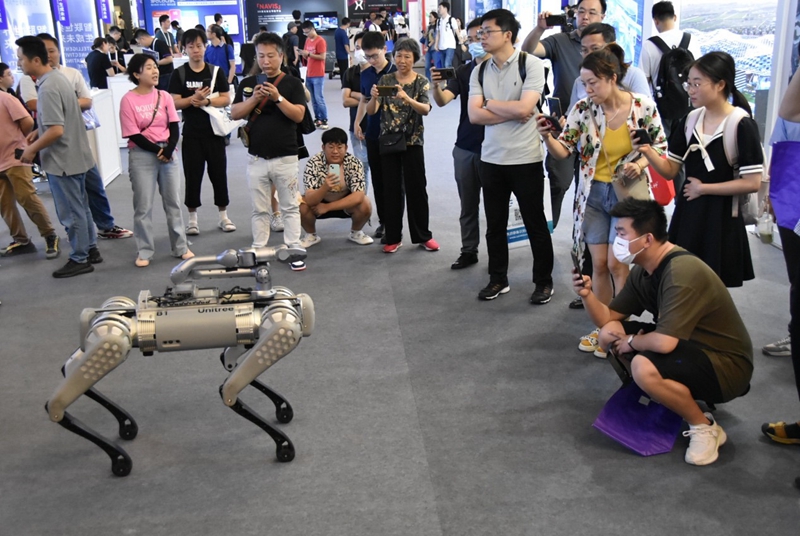 参观者驻足观赏四足机器人演示。新华网实习生 李春秋摄