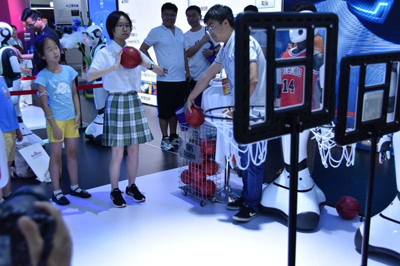 青少年学生在人工智能大会上和具形机器人比拼投篮。新华网实习生 李春秋摄