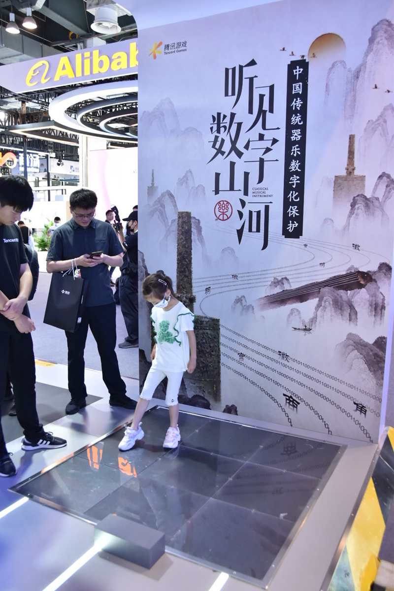小朋友在人工智能大会上体验旨在数字化保护中国传统器乐的腾讯游戏《听见数字山河》。新华网实习生 李春秋摄