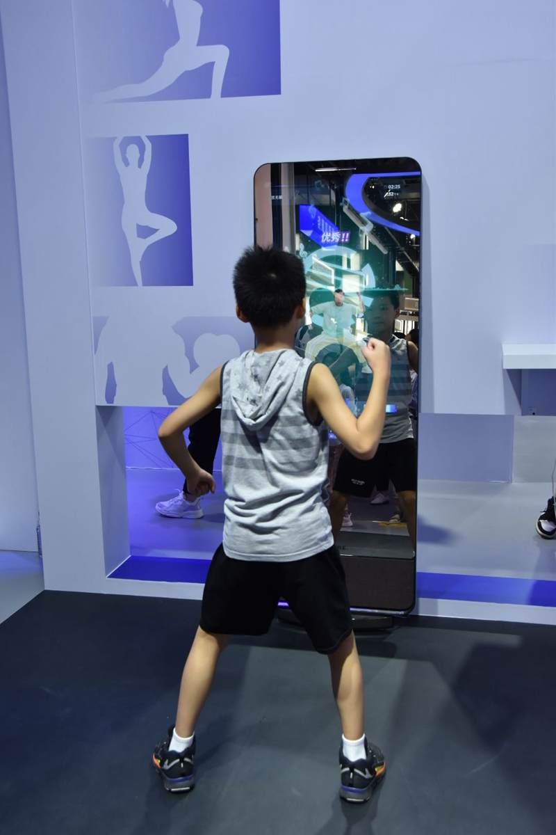 一青少年在人工智能大会上挑战智能健身游戏。新华网实习生 李春秋摄