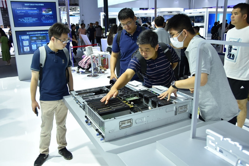 参观者在人工智能大会上观摩由中科曙光推出的训练服务器。新华网实习生 李春秋摄