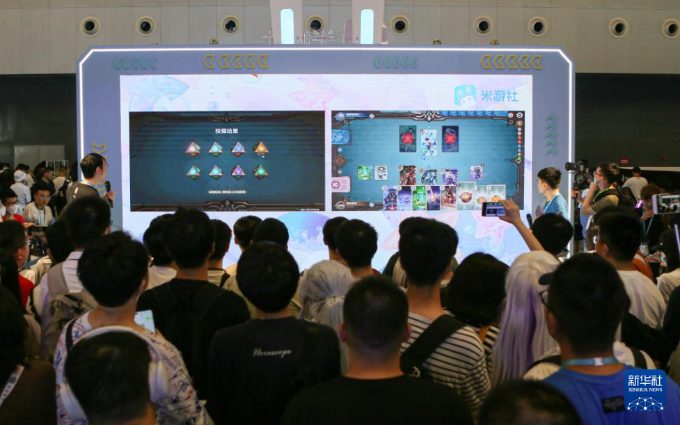7月13日,参观者在米游社展位观看卡牌对战游戏直播。