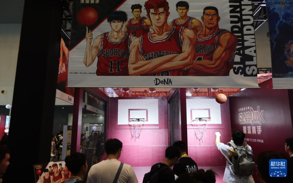 7月13日,参观者体验投篮。
