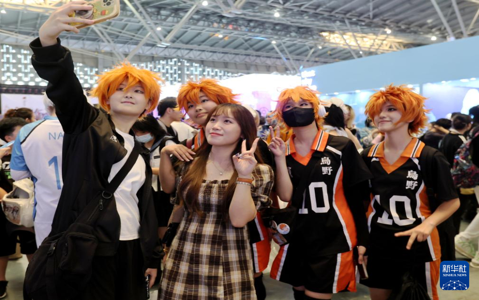 7月13日,参观者和动漫造型的角色扮演者合影。