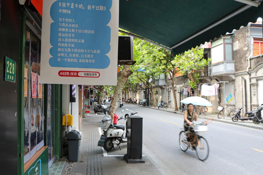 8月8日,市民经过位于黄浦区淡水路的诗歌艺术装饰。