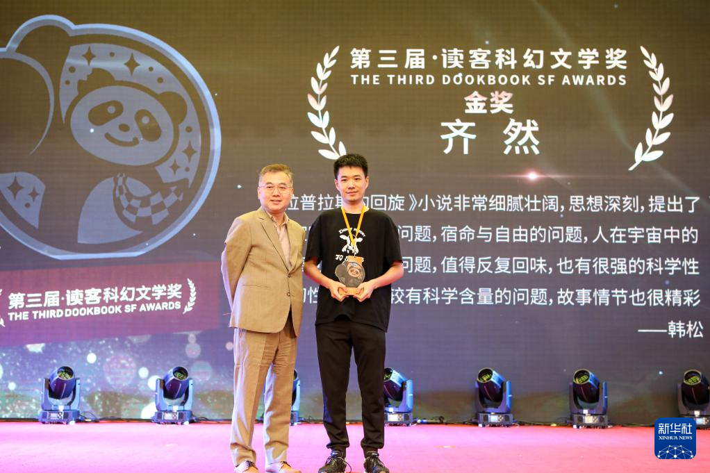 8月19日,第三届读客科幻文学奖金奖获得者齐然(右)上台领奖。