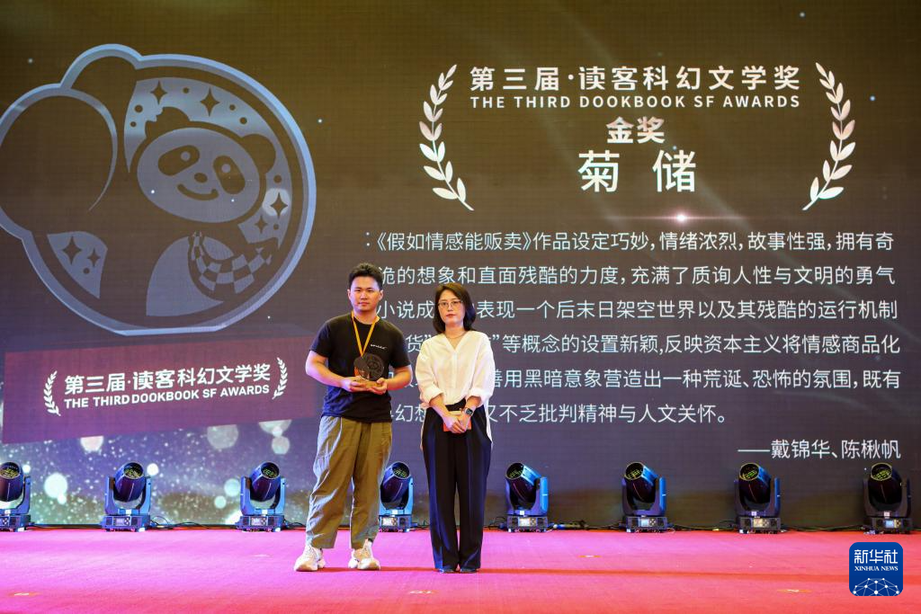8月19日,第三届读客科幻文学奖金奖获得者菊储(左)上台领奖。