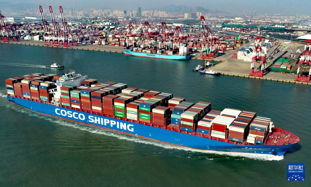 2021年2月19日,在位于山东自贸试验区青岛片区的山东港口青岛港前湾集装箱码头,一艘满载集装箱的货轮驶出港口(无人机照片)。新华社发(张进刚 摄)