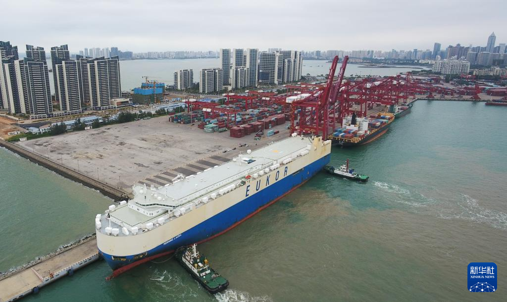 2020年2月16日,滚装货船“劳拉”轮驶入海口秀英港(无人机照片)。这是海南自贸区政策实施后的首艘汽车外贸船。新华社记者杨冠宇摄