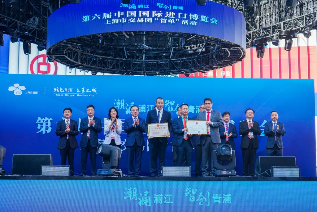 第六届中国国际进口博览会11月5日在上海开幕,上海市青浦区市场监管局为沙朗爵士供应链管理(上海)有限公司和云仟牧食品(上海)有限责任公司分别颁发本届进博会参展商的首张营业执照和首张食品经营许可证。