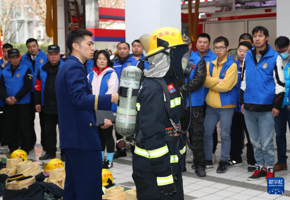1月31日,长宁区消防救援支队消防指导员(左一)在向志愿者们介绍楼宇消火栓的基本结构。
