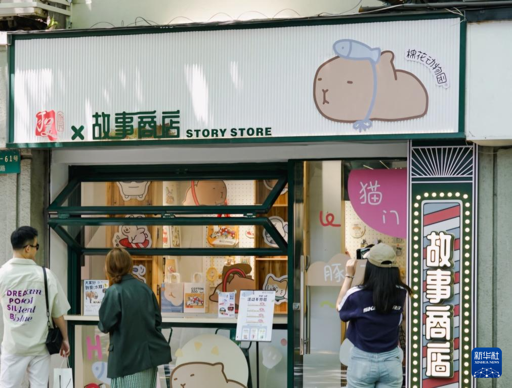 “五一”假期的愚园路成为了上海“流量中心”之一。在这条小马路上,有一家“故事商店”正在进行着一场名为“快乐锦鲤计划”的插画快闪活动,小小的一家铺面被六只卡通动物形象的周边产品填满,不少年轻人走进小店选购产品的同时,也在一面故事墙上留下自己在愚园路上的所思所想。
