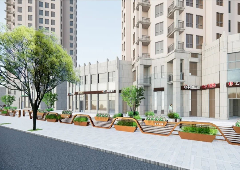 馨宁公寓沿街商铺的前区原本是一处小型停车场,“除了停车,我们从来没想过这里还能有什么用途。现在有了这些休闲设施和绿化,终于感觉有人气、有活力了。”周边居民说道。通过“三驾马车”协商,改造项目中对原有停车功能做了取消,释放公共空间,增设街道小品,既美化了城市界面,也将公共空间资源还之于民。