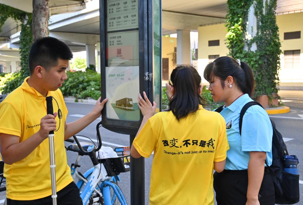 学员们在老师带领下走上街头学习使用公交车站牌定位技巧(7月30日摄 )。