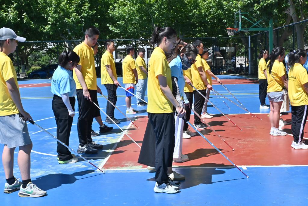 学员们在华东师范大学内的一个篮球场上进行盲杖使用技巧的课程(7月29日摄 )。