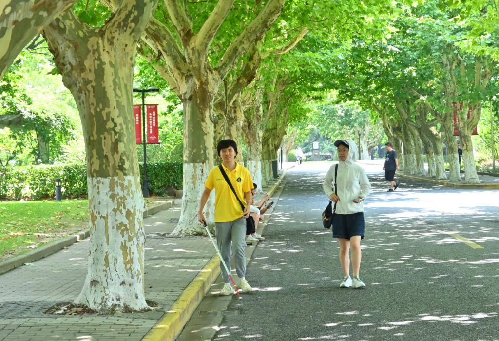 学员彭香香(左)在志愿者跟随下进行盲杖独立出行训练(7月31日摄)。