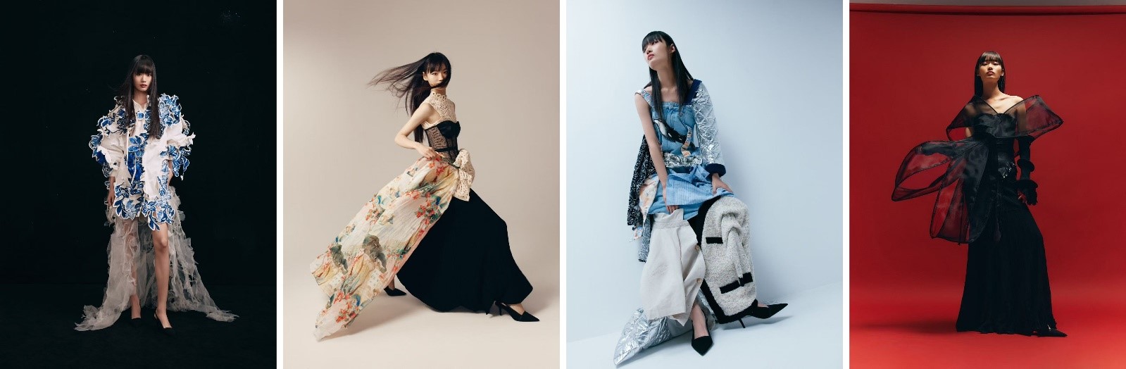 兼具时尚与可持续性的获奖作品(从左到右依次为《活态诗学·虚实青韵》-黄斯赟、《The Impossible Wardrobe》-林明锜、《Alight》-马滢儿、《Black Mirage》-王芷涵)