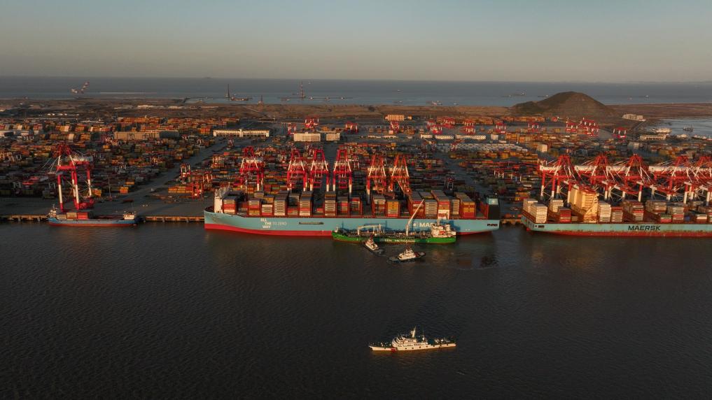 记者从洋山港海事局获悉,1月1日17时,在洋山港海事局远程安全监控和海巡艇现场护航下,“海港致远”轮安全靠泊在洋山深水港冠东码头“安妮马士基”轮外侧,在此后的十余个小时内将为“安妮马士基”轮加注甲醇燃料3000吨。