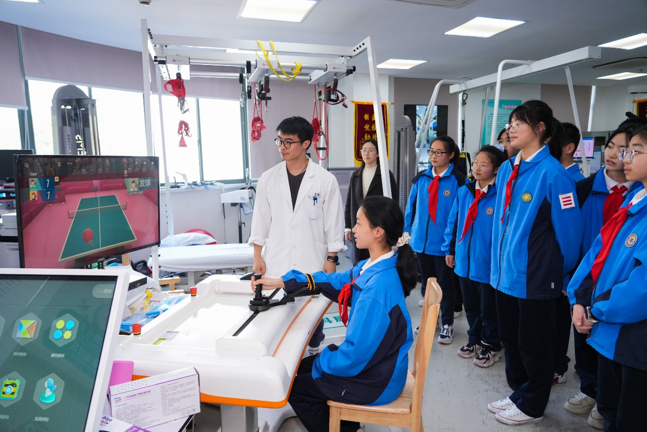 “你眼中的社区医院是什么样子的?”作为驻扎于社区的邻里健康伙伴,社区医院对于“年轻的小伙伴”而言,始终是一个既亲近又陌生的阵地,而此次的深入探访之旅,则让记者团成员们得以用五感来“沉浸式”地感知这一份洋溢在“家门口”的健康温度。SET悬吊设备、下蹲肌群、无轨迹揽柱运动控制功能评测训练系统、踝关节机器人、上下肢交叉运动训练器......映着午后的暖光,形色各异的康复“黑科技”在刹那间便吸引了记者团的驻足围观。区别于单一的传统治疗,在数智化技术的赋能下,一批批精准高效的仪器设备不仅令社区的康复速度“再增能”,更令康复过程变得更具有趣味性、持续性。