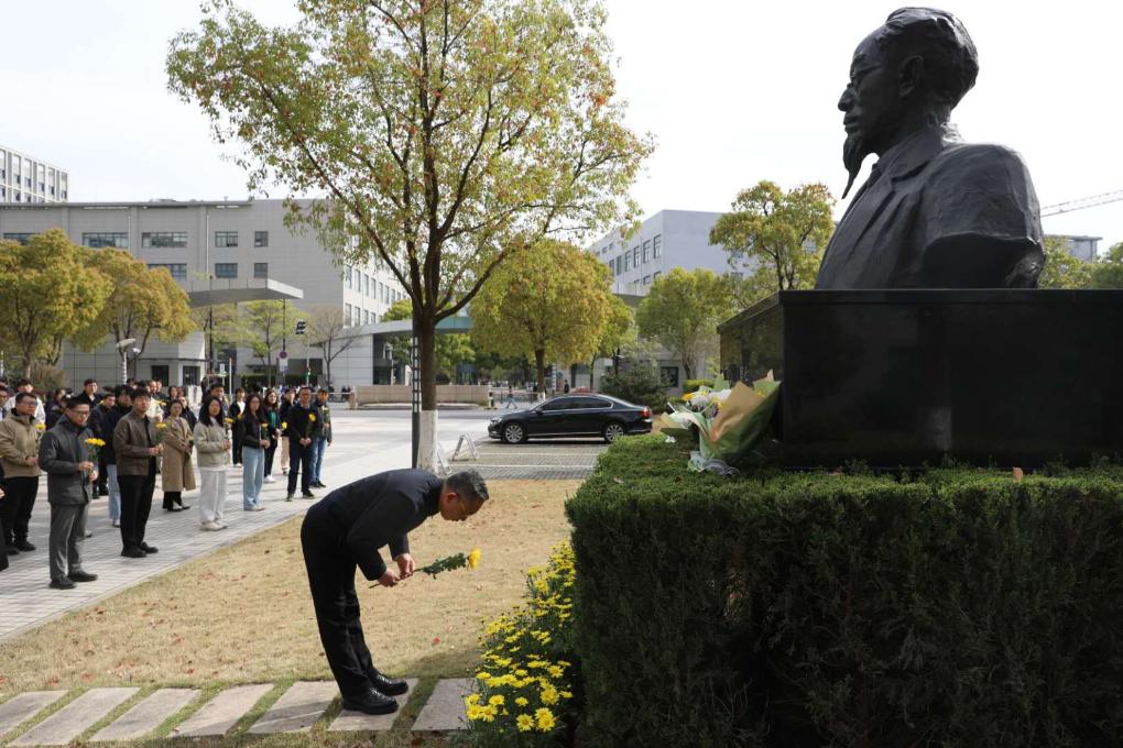 在殷之文先生雕像前,人工晶体研究中心的高级工程师和新材料中试研发中心的青年科研人员代表回顾了殷之文先生在功能陶瓷和闪烁晶体等领域的研究和科研历程,表示要传承殷之文先生的爱国情怀和创新奉献精神,科研工作应满足国家重大需求,敢于挑战、善于作为。