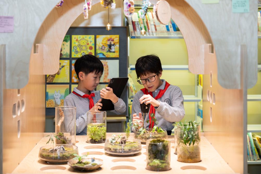 4月11日,在上海师范大学附属闵行第三小学的花香书院内,学生在自然课上观察植物生长情况。