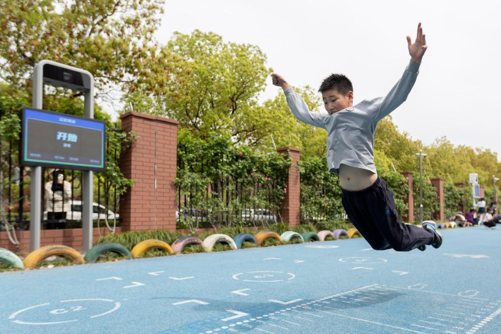 4月11日,在上海师范大学附属闵行第三小学,学生在体育课体验AI跳远测试,智能设备能在学生跳远后展示成绩。
