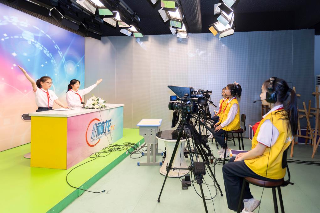 4月11日,在上海师范大学附属闵行第三小学南校,学生在校园电视台录制节目。