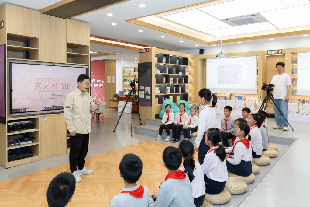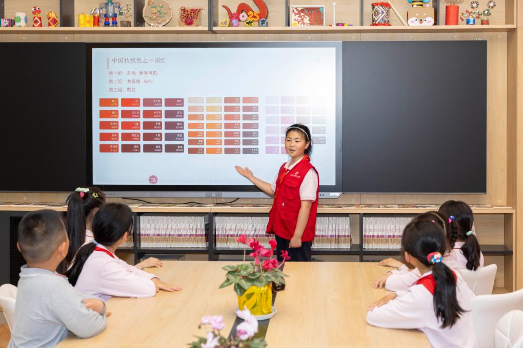 4月11日,在上海师范大学附属闵行第三小学南校,学生讲解员在新建成的融合信息化技术的真火图书馆分享中国传统色彩课。