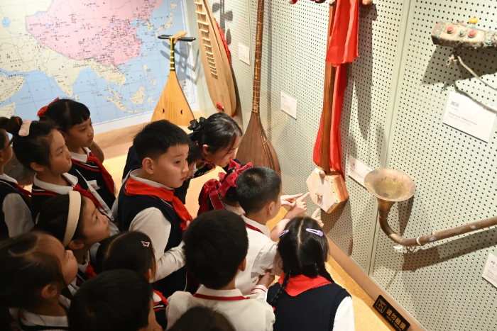 博物馆内,三个展厅分别展示了“乐史熠熠 古今相继”“乐声袅袅 融贯神州”“乐音振振 赓续文脉”三大篇章,通过精选的乐器展品,讲述着中华民族交往交流交融的历史,以及中华文明博大精深的内涵。孩子们近距离观赏了琴、笛、渔鼓、筝等来自不同历史时期、不同地域的乐器,仿佛这些无声的“时光讲解员”正在诉说着千年的故事。