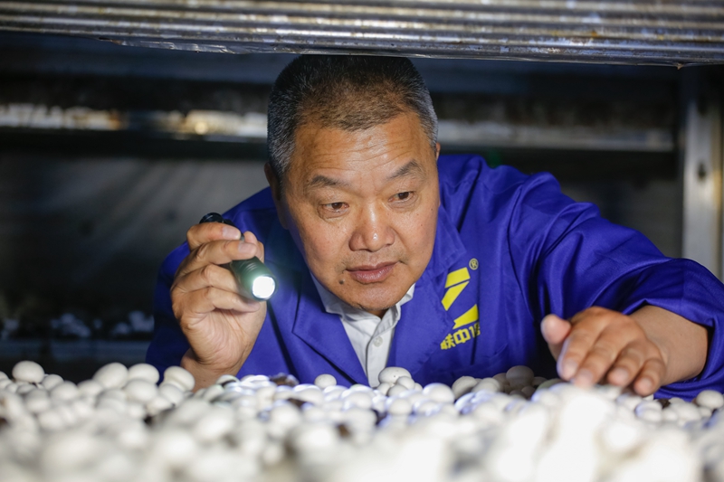 图为联中合作社负责人陈林根在菇房查看双孢蘑菇