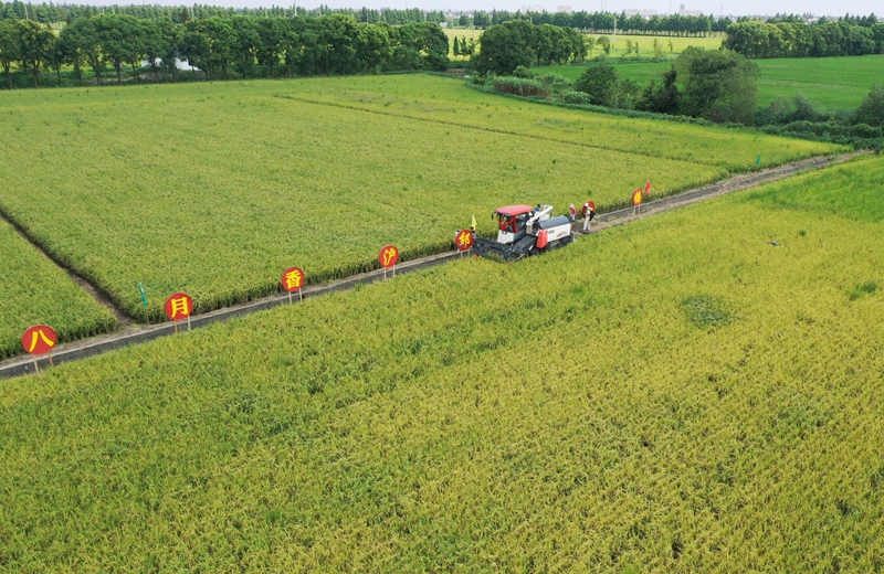 图为上海农业生物基因中心廊下基地,节水抗旱稻“八月香”收割现场