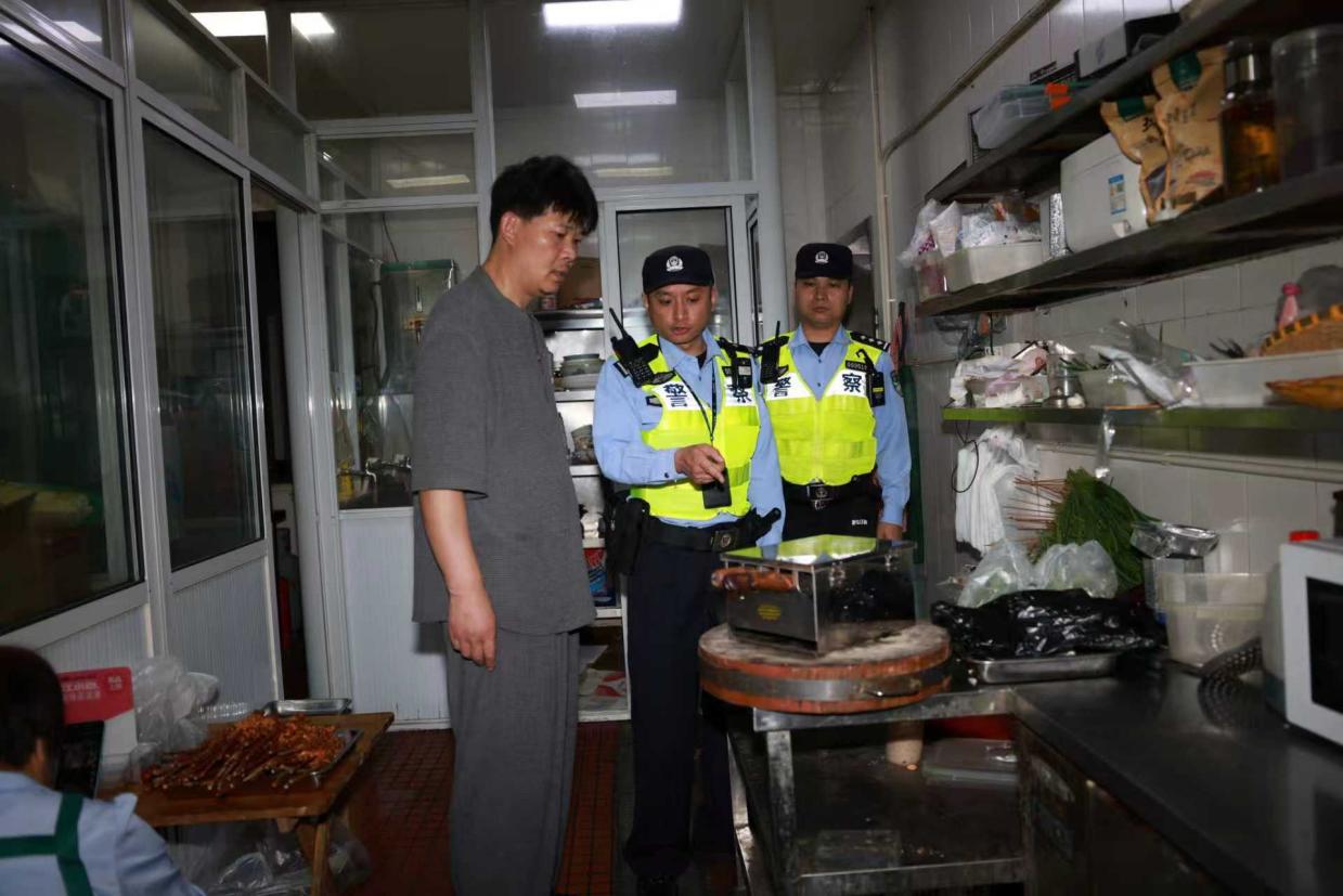 (图为城桥派出所民警在夜宵店开展安全检查)