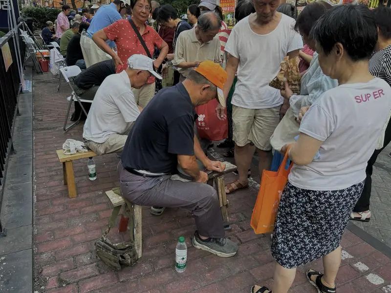 傍晚时分,摊位一摆、灯光一亮,少了白日里的暑气,多了独属于夏夜的烟火气——消食散步的长者顺路来修鞋;遛弯的阿姨把家里的旧伞交给师傅;等候的队伍里,闲话家常的欢声笑语不绝于耳……