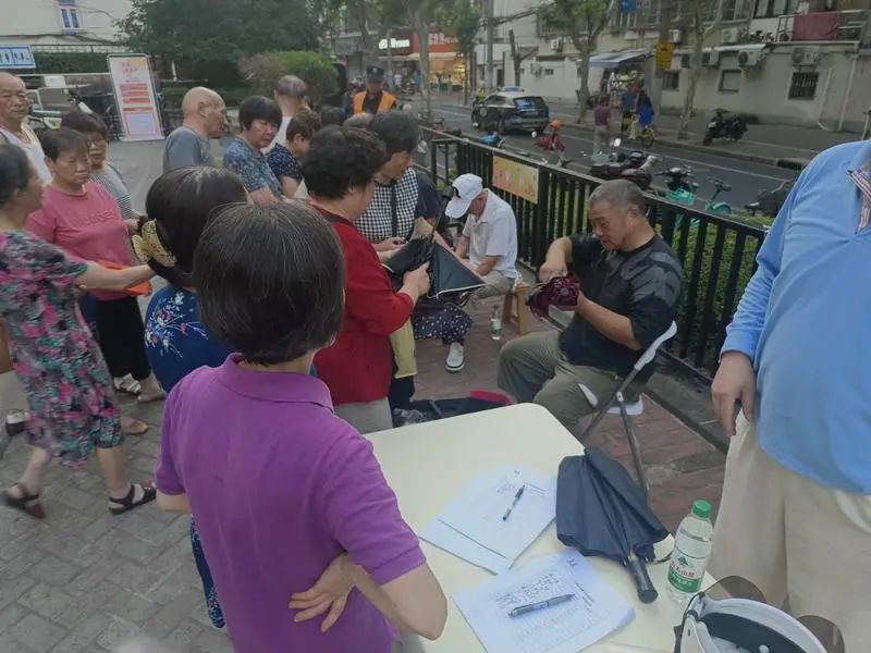 本次活动的“明星摊位”当属磨刀、修伞,晚上6点活动刚一开始,居民们便在摊位前有序地排起队伍。磨刀师傅动作娴熟地清洁、打磨刀具,修伞师傅耐心地调整伞柄、修补伞架,一件件旧物在师傅们的巧手下焕然一新。