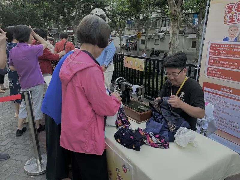 另一边的缝补摊位上,针线灵巧翻飞,袖口磨破的衬衫、裤脚太长的裤子,经巧手一缝,立马变得合身又整洁。
