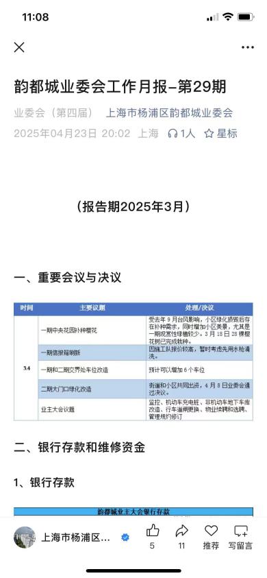 围绕业主最关心的“人、财、事、物、权”,制定“8+X”公开清单,8个核心领域主动公开,从议事规则到服务合同样样清晰;X类专业资料应需公开,合同全文、工程审价报告等随时可查。透明社区OA实时同步账本,物业公众号推送月报,形成“全领域、全流程”的公开模式,精准锁定群众关切点,用清单化管理明确公开内容,让居民对社区事务“看得见、摸得着、查得清”。