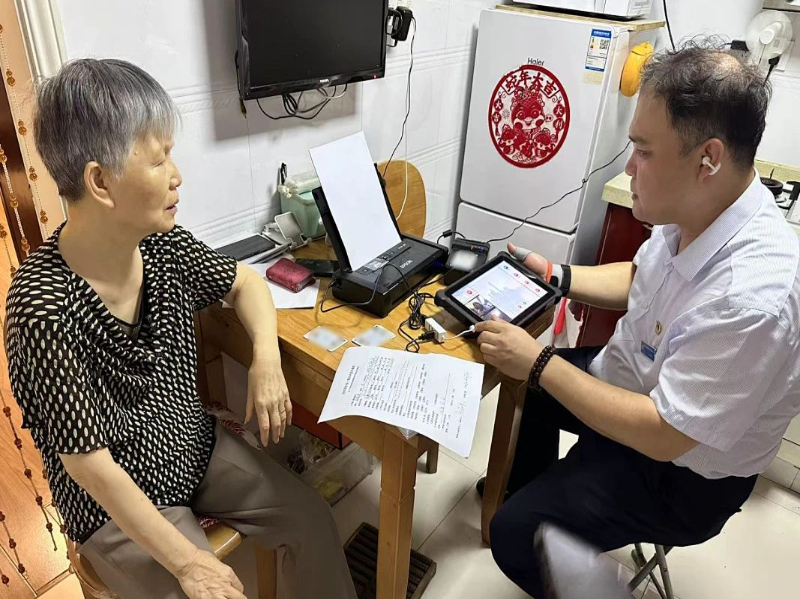 更为贴心的是,对于90岁以上高龄老人、行动不便的重度残疾人等特殊群体,工作人员还能背上这套设备,提供“上门办”服务。推广体验活动当天,工作人员就背上这套便携的智慧设备,直接走进居民家中,将“受理窗口”开设在床头、饭桌前。无论是办理长护险状态评估,还是申请各类补助,所有需要本人亲自办理的业务,都能在足不出户的情况下完成。