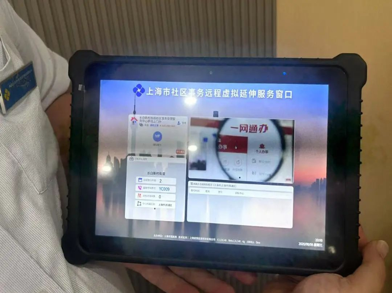 实现这一切的“法宝”,正是现场居民办理业务围着的那台“上海市社区事务远程虚拟延伸服务窗口”移动终端。它类似一扇可以移动的的窗口,通过内置的移动网络,能直接与受理中心的业务系统和叫号系统无缝对接。