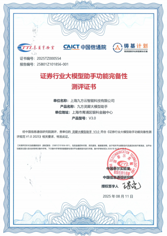 九方灵犀大模型助手成为证券行业首个通过信通院大模型功能完备性测评的产品,这不仅是对公司人工智能中心及网络信息安全中心技术实力与研究成果的认可,更标志着证券行业大模型应用迈入“标准可依、测评可证、安全可靠”的规范化新阶段。