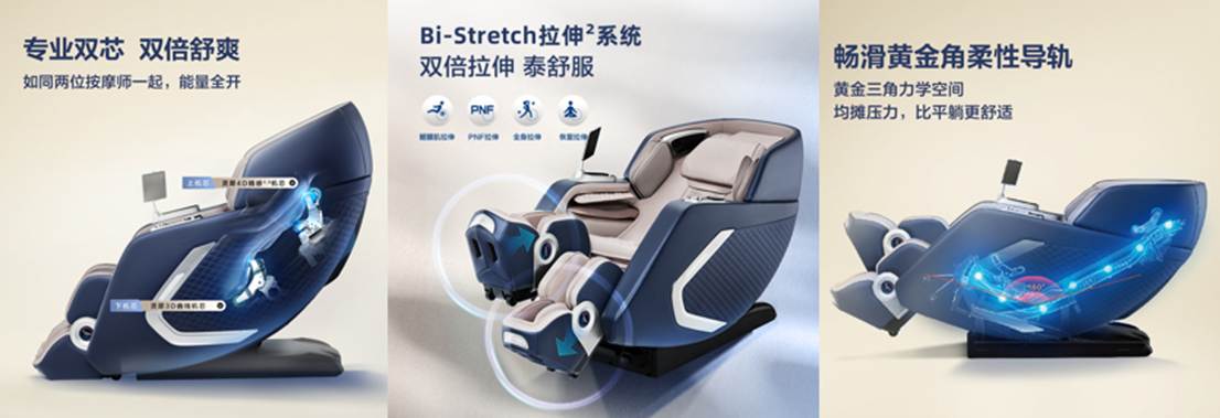 技术的创新也是A70MAX的爆点,该产品首次融合多项黑科技,尤其是Bi-Stretch拉伸²系统,突破传统按摩椅的腿部一体化设计,打造双腿分离式应用,模拟蹬腿、骑行、走路等动作,让腿部和各关节得到有效的释压和拉伸,给用户提供前所未有的新体验。