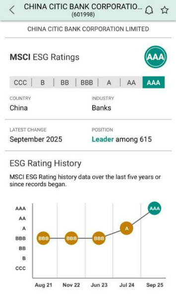 近日,国际权威指数机构明晟(MSCI)发布2025年度中信银行(601998.SH,00998.HK)环境、社会及管治(ESG)最新评级结果,评级由“A”上调两级跃升至全球最佳等级“AAA”级。这是继2024年从“BBB”提升至“A”后,中信银行MSCI ESG评级连续第二年提升,在全球同业中处于领先(leader)水平。