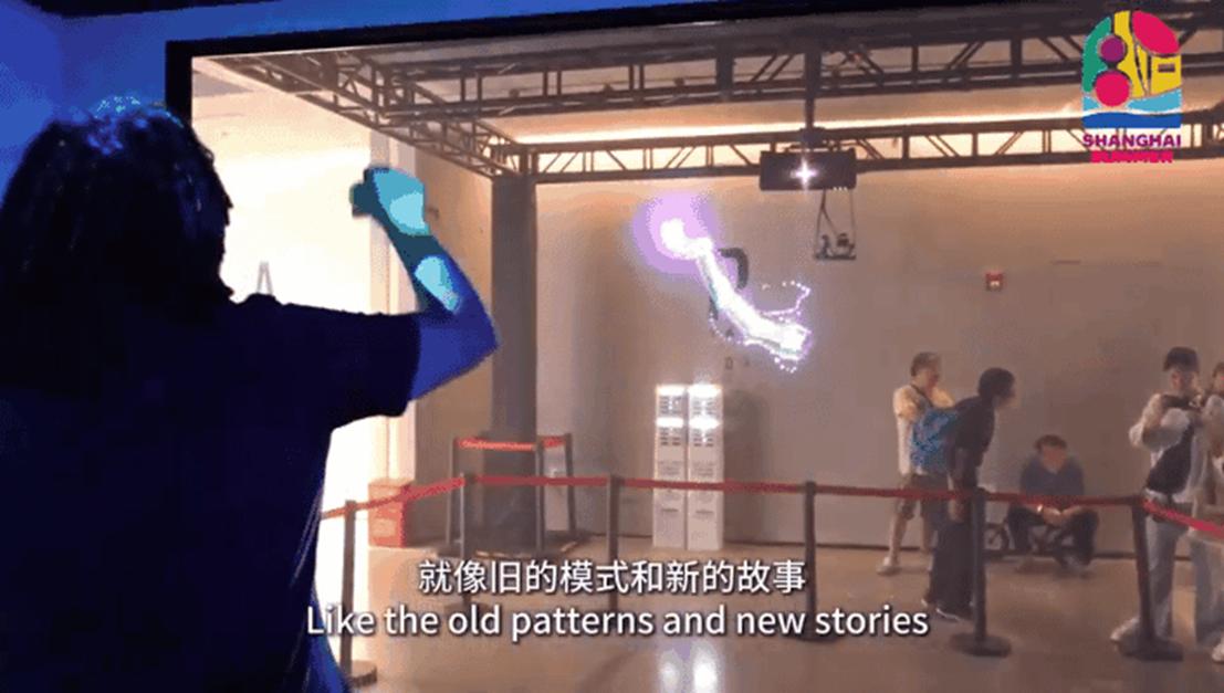 旅程首站,陈安忆来到了西岸穹顶艺术中心。在这里,他步入了360度全景沉浸式环绕包裹光影空间,流光溢彩在穹顶与地面间奔涌流转,历史建筑的轮廓与未来感的线条交相辉映,传统纹样在数字技术中焕发新生。陈安忆感慨道:“这里的光影令人震撼,里面不仅隐藏了上海的历史图景,更演绎着充满活力的新故事,技术与文化的自然融合搭配城市的温暖舒适,让我感受到了上海这座城市的独特文化魅力。”